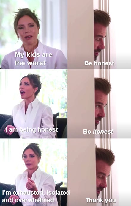 Sorry to start with a cliché one, but reading the studies about parental burnout and overwhelm made me very sad. Most people can only do so much about their working hours in this economy, but many of us also take on optional things that should never come at the cost of getting good sleep and a moment to rest. Having a tidy house, cooking from scratch and sending out this Substack on time have taken a back seat for me this month! I can think of so many times I’ve seen an exhausted parent do something completely superfluous when what they really needed was a nap.